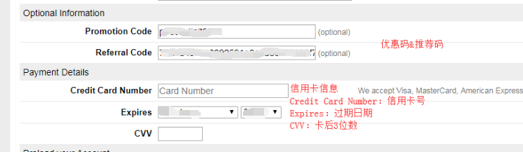 首先要注册一个新的Linode账户(需要信用卡)。输入你的邮箱、用户名、密码,创建用户。新建用户后,会给你的邮箱发送一个邮件,点击邮件中的Confirm的链接即可完成注册。完成注册后跳转到Linode的后台,需要完善自己的账号信息,这时候在Promotion Code一栏填写优惠码,在Referral Code填写推荐码,就可以获得至少20美元的充值优惠。
