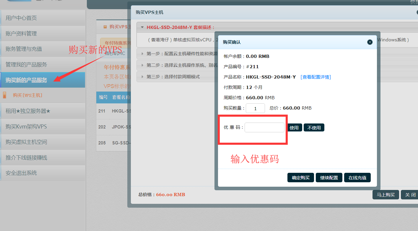 登入LOCVPS账户后,选择适合自己的VPS主机,点击立即购买,选择性能、操作系统、IP、付款信息等信息后点击马上购买,会弹出一个购买确认会话框,在这个会话框中的优惠码文本框中输入优惠码,点击使用即可享受优惠。